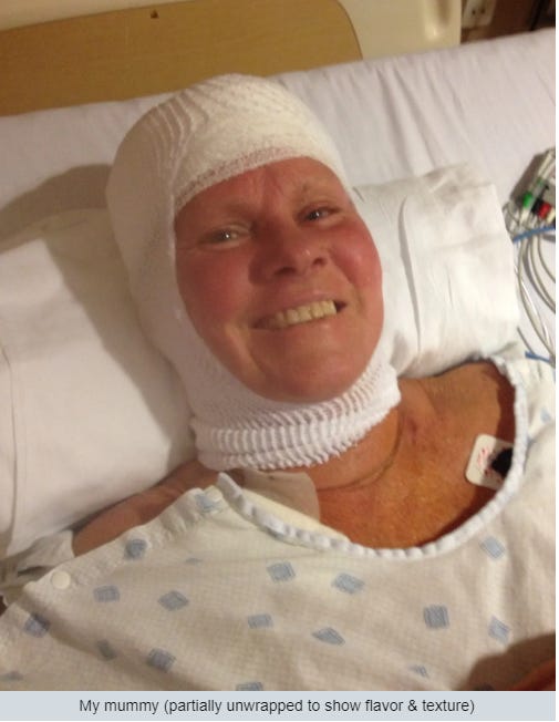 An unknown & unidentified virus had infiltrated my mother's central nervous system and caused encephalitis & hydrocephalus - swelling in the brain stem leading to a build-up of cerebrospinal fluid in her third ventricle & increased intracranial pressure. The pressure & swelling was so severe that it was borderline lethal; had my father waited one more day to take her into the hospital, she would not have survived. An emergency surgery had been scheduled to drain the fluid immediately. If she survived the procedure, a second operation would follow that would place in her brain a shunt to drain the fluid. However, due to the very high pressure levels, we warned that it was highly likely that there would be some permanent damage resulting in irreversible changes to her neurological function. Assuming she survived both procedures, her neurological status and the degree to which her personality, memory, & cognition would recover were both unknown.